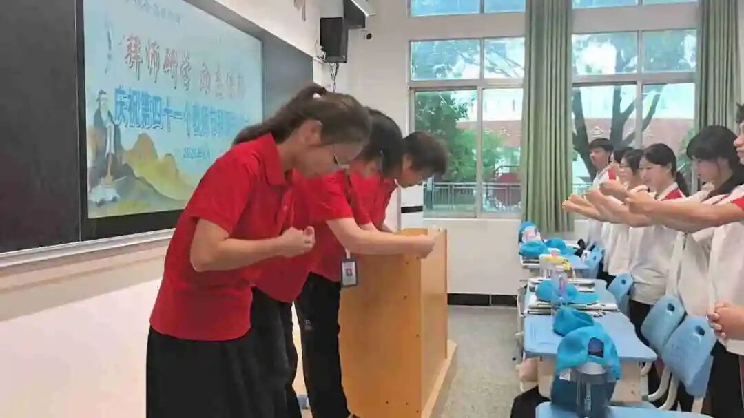 2025年9月10日是我国第41个教师节。为弘扬中华民族尊师重道的传统美德,让学生践行尊师明礼,培养学生的感恩之心。一场庄重而温馨的拜师礼在班级举行。一拜:拜谢老师启蒙之恩;二拜:拜谢老师教诲之义;三拜:拜谢老师陪伴之情。