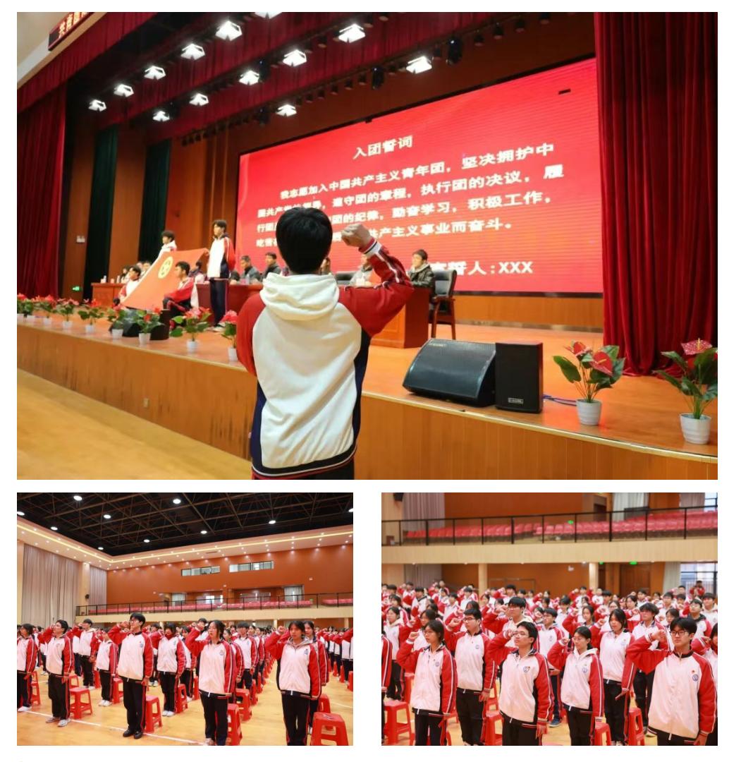“我志愿加入中国共产主义青年团……”在优秀团员代表叶远怀同学的带领下,新团员们面对鲜艳的团旗,举起右拳庄严宣誓。铿锵有力的誓言回荡在会场,表达了新团员们坚定不移跟党走、为共产主义事业奋斗终身的坚定信念。
