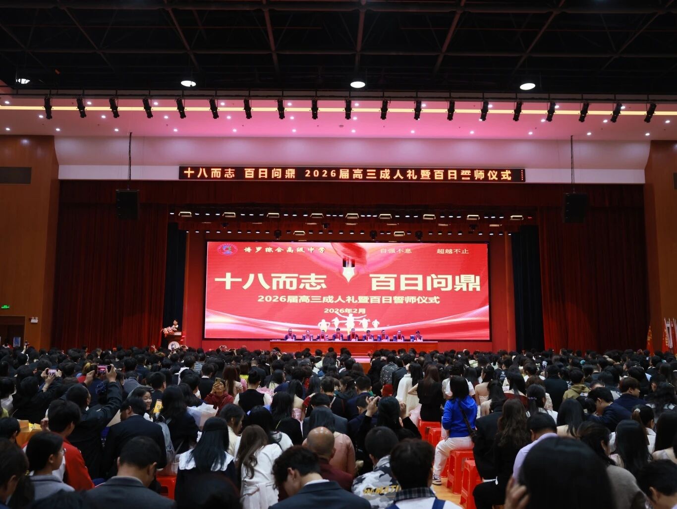 父母牵手,师长相伴,学子们稳步跨越“成人门”。走向的,是独立的人生;迎接的,是辽阔的世界。这是一场仪式,更是一次唤醒:唤醒担当,唤醒勇气,唤醒那个为梦想拼尽全力的自己!一百天,是冲刺更是绽放;十八岁,是终点更是起点!愿你们: 心中有火,眼里有光;笔下有山河,脚下有力量。以成年之志,赴百日之约,在2026的盛夏,书写属于自己的辉煌篇章!